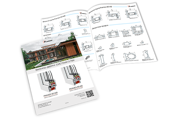Зрізи систем, технічні та експлуатаційні характеристики, перелік основних, додаткових профілів та комплектуючих віконно-дверних систем з ПВХ Framex 80 AD та 80 МD.
